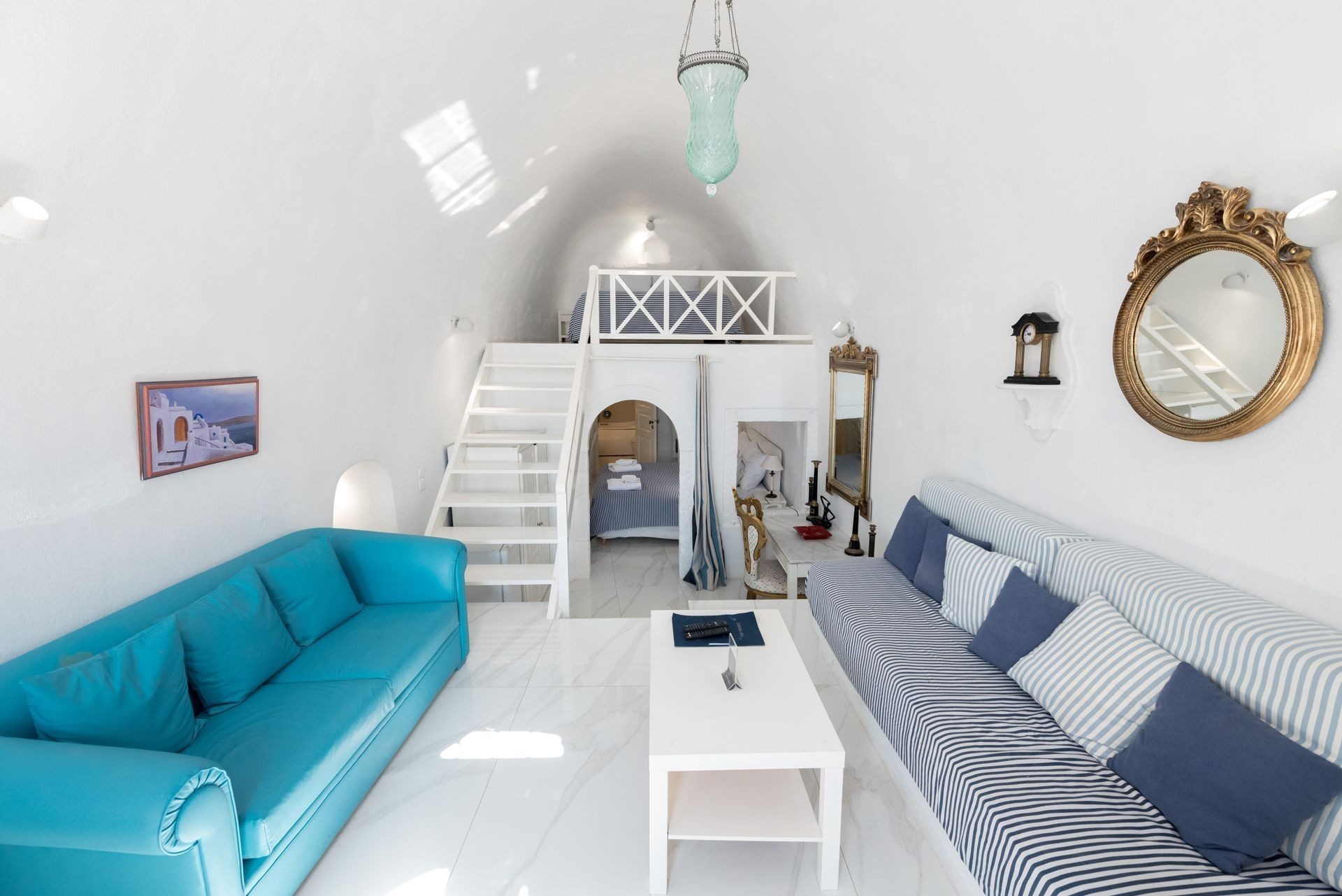 Living room, one or two bedrooms, one bathroom with bathtub & Jacuzzi, private balcony offering views to the Caldera.